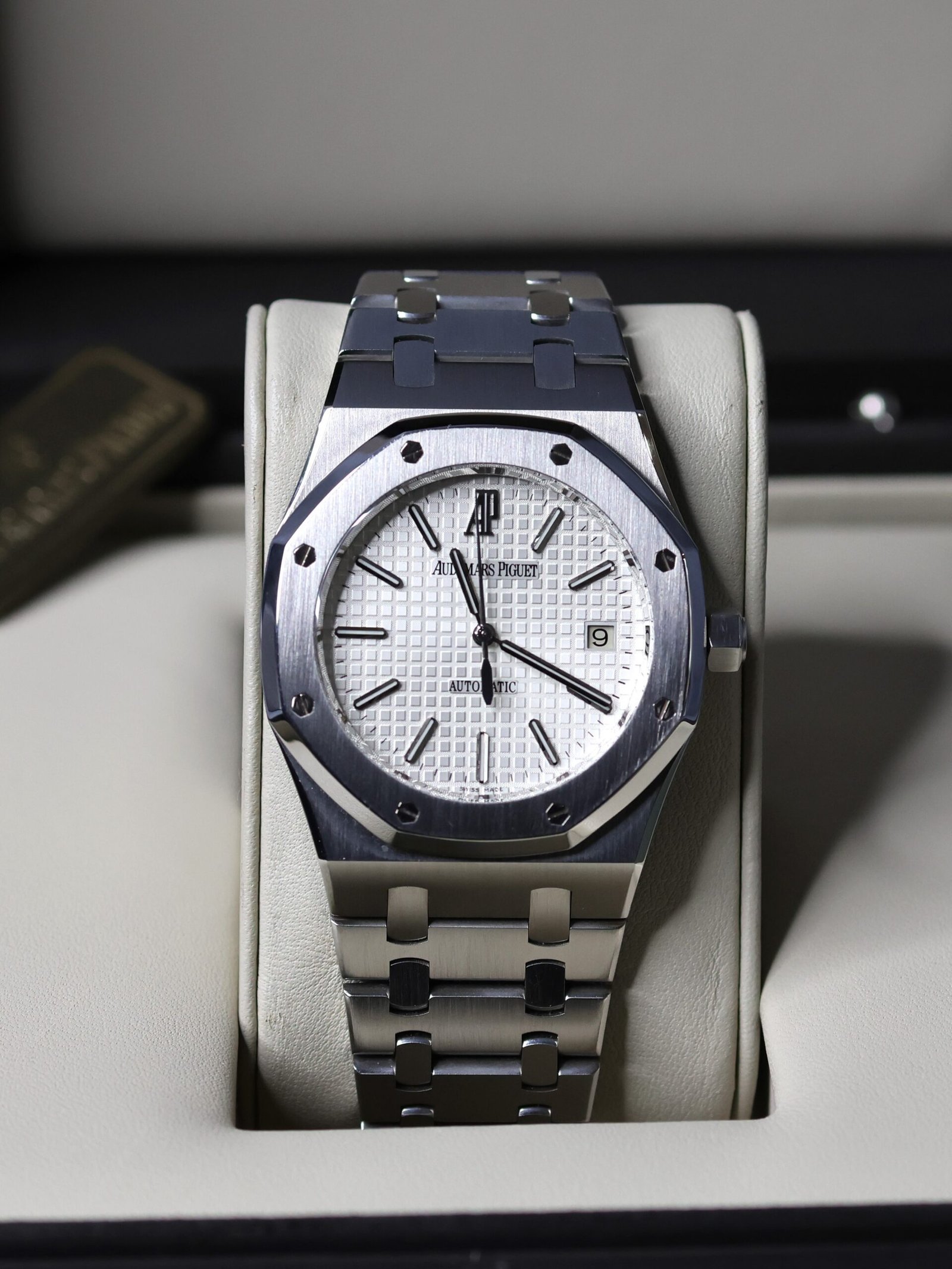 The iconic Audemars Piguet Royal Oak is a true symbol of luxury and craftsmanship. This 39mm steel case model from 2011 features the signature "Tapisserie" patterned white dial, combined with a sleek steel bezel and bracelet.