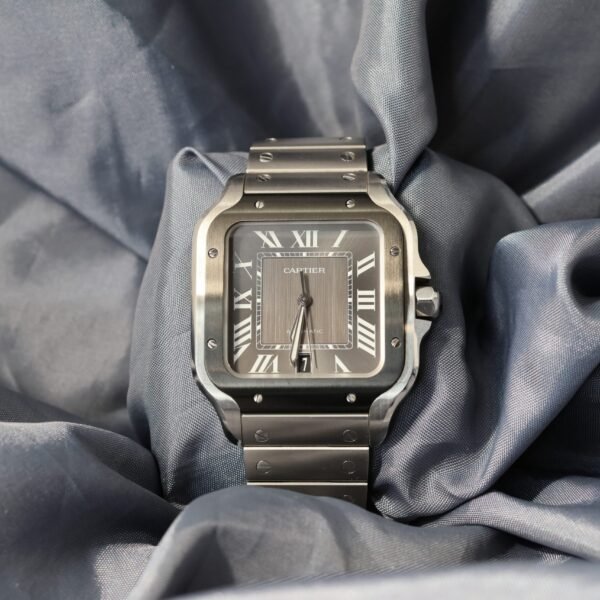 This Cartier Santos 39.8mm with a sleek black dial is one of the most versatile and contemporary designs in the Cartier lineup. Crafted in brushed stainless steel and paired with three strap options (steel, leather, and rubber), it’s a watch that can shift seamlessly from formal to casual wear. The luminous Roman numerals and automatic movement combine classic Cartier elegance with modern performance.