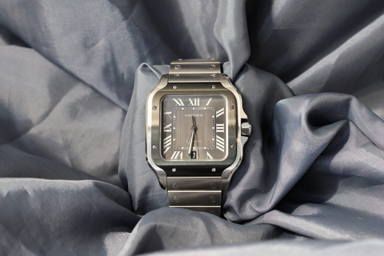 This Cartier Santos 39.8mm with a sleek black dial is one of the most versatile and contemporary designs in the Cartier lineup. Crafted in brushed stainless steel and paired with three strap options (steel, leather, and rubber), it’s a watch that can shift seamlessly from formal to casual wear. The luminous Roman numerals and automatic movement combine classic Cartier elegance with modern performance.